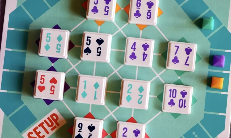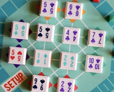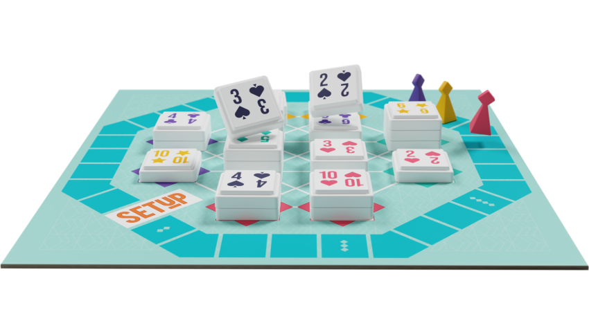 Em SETUP, os jogadores devem combinar naipes e números em peças semelhantes a cartas para marcar pontos. A colocação é fundamental: é possível criar combinações em qualquer direção ou até empilhar peças para atrapalhar o oponente. Uma única jogada pode gerar pontos em múltiplas sequências ao mesmo tempo — mas é preciso cuidado para não abrir caminho para que o adversário também pontue! SETUP garante uma disputa dinâmica de construção de sequências para toda a família.