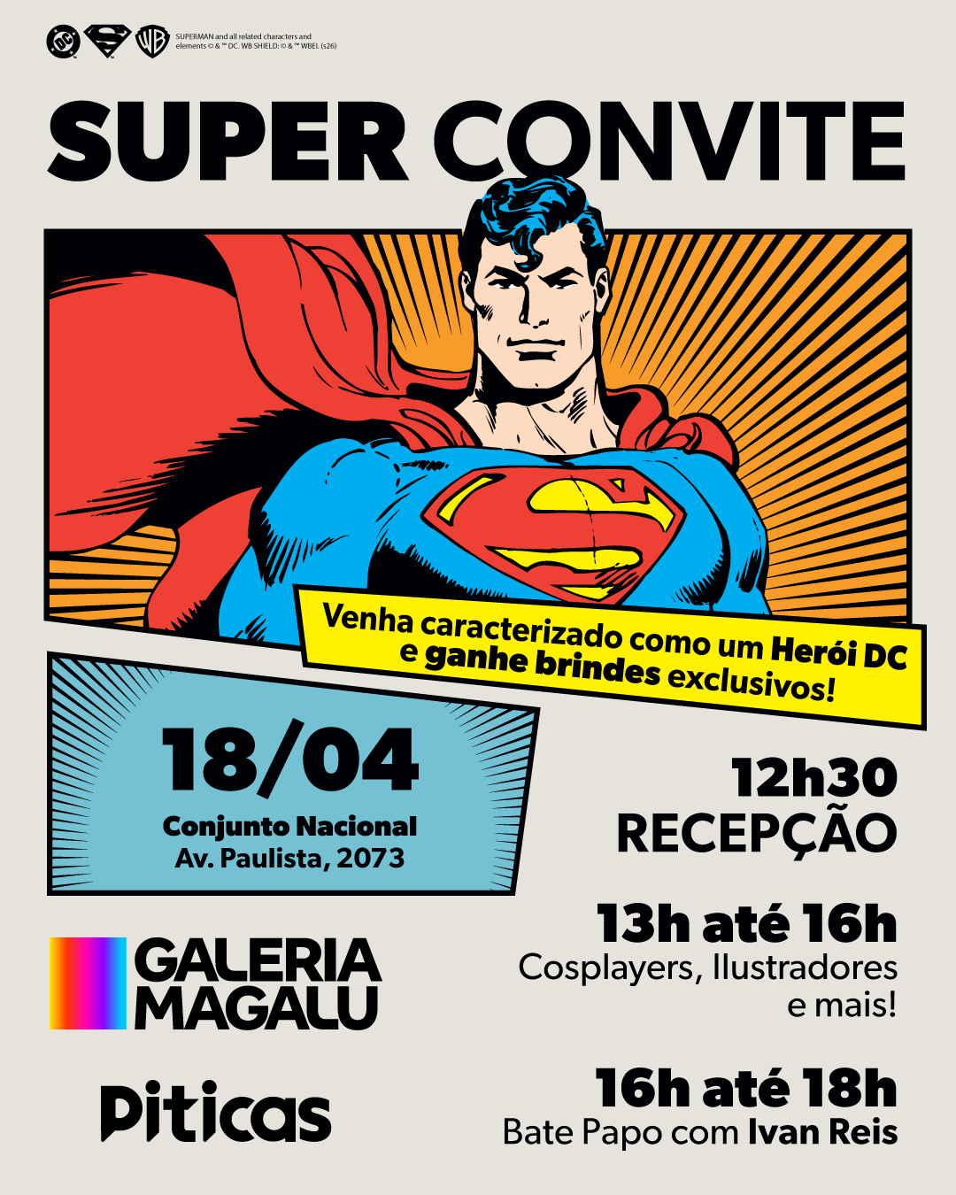 A Piticas, maior franquia do Brasil de produtos licenciados de entretenimento, e a Galeria Magalu, em parceria com a Warner Bros. Discovery Global Consumer Products, promovem no próximo 18 de abril (sábado) uma programação especial em celebração ao Superman Day, data global dedicada ao herói.