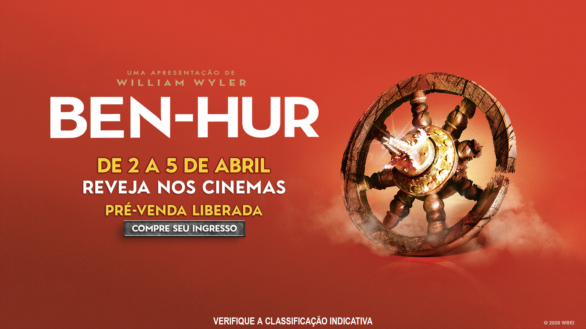 Em comemoração ao feriado de Páscoa, a Warner Bros. Pictures anuncia o relançamento especial do monumental clássico do cinema, Ben-Hur (1959). O filme, aclamado pela crítica, retornará às telonas em uma exibição limitada com sessões entre os dias 2 e 5 de abril (quinta a domingo). A pré-venda de ingressos já está disponível em cinemas selecionados por todo o Brasil.