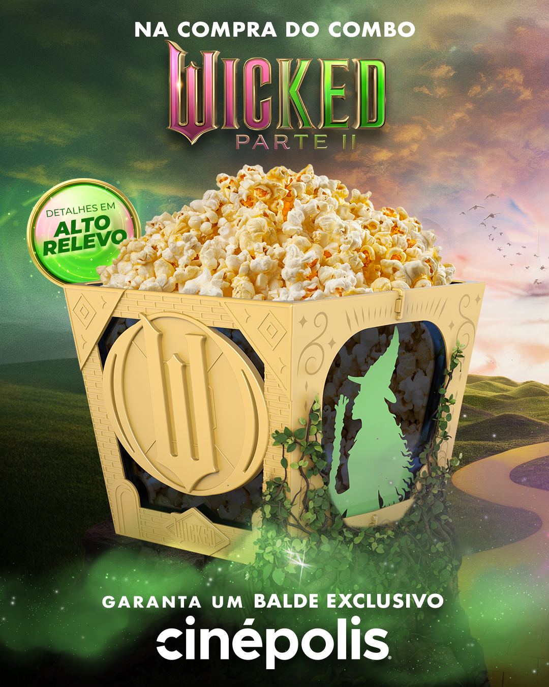 A Cinépolis, maior operadora de cinemas da América Latina, iniciou a pré-venda de ingressos para Wicked: Parte II e acaba de lançar um combo exclusivo que promete encantar os fãs do filme. Para celebrar a chegada da aguardada sequência de um dos musicais mais famosos do mundo, a rede lança um balde de pipoca colecionável com design inspirado no universo mágico de Oz.