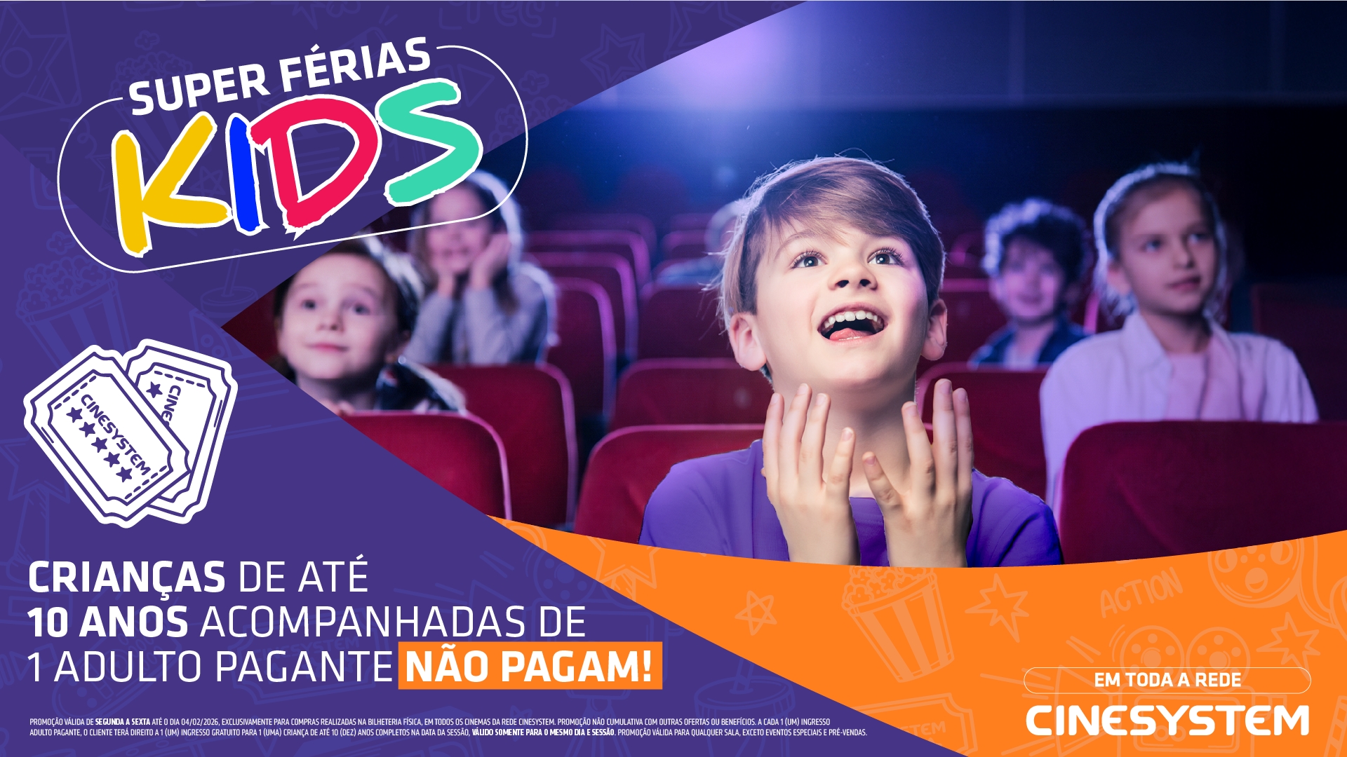 Cada adulto pagante tem direito a 1 ingresso gratuito para 1 criança com até 10 anos completos, para o mesmo dia e sessão, de segunda a sexta. A promoção não é cumulativa com outras ações e vale para qualquer sala e poltrona, exceto eventos especiais e pré-vendas. Para conferir os filmes e horários, basta acessar o site www.cinsystem.com.br