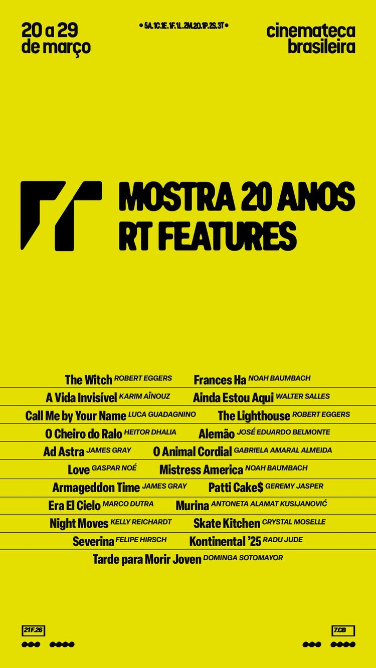 A programação da Mostra 20 Anos RT Features reúne 21 títulos que revisitam o percurso da produtora ao longo dessas duas décadas. Entre os longas que serão exibidos, estão obras marcantes do cinema brasileiro, como Alemão, de José Eduardo Belmonte, e O Animal Cordial, de Gabriela Amaral Almeida; e filmes que fizeram a empresa atravessar gêneros e fronteiras, como Frances Ha, do norte-americano Noah Baumbach; Me Chame Pelo Seu Nome, do italiano Luca Guadagnino; Tarde Para Morrer Jovem, da chilena Dominga Sotomayor; O Farol, do norte-americano Robert Eggers; e o recente Kontinental’ 25, do romeno Radu Jude. A mostra é uma parceria da RT Features com a Cinemateca Brasileira e é produzida pela Naked Company.