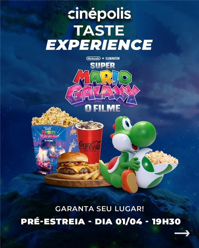 A Cinépolis, maior operadora de cinemas da América Latina, anuncia uma experiência exclusiva para celebrar a chegada de Super Mario Galaxy: O Filme aos cinemas. No dia 01 de abril, às 19h30, os fãs poderão participar da Cinépolis Taste Experience Mario Galaxy, um evento que une cinema, gastronomia e itens colecionáveis em uma noite inspirada no universo do filme.