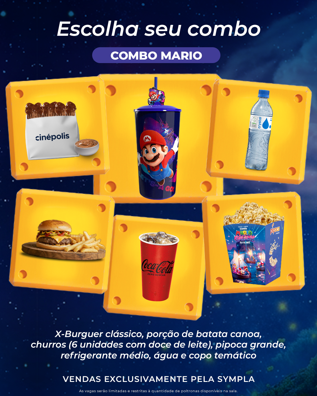 Os clientes poderão escolher entre duas opções de combos temáticos: Combo Yoshi e Combo Mario, ambos pensados para tornar a sessão ainda mais imersiva. Além do ingresso para o filme, as opções incluem X-burguer clássico, porção de batata canoa, churros (6 unidades com doce de leite), pipoca grande salgada, refrigerante 500 ml, água sem gás 500 ml e um colecionável exclusivo. No Combo Yoshi, o público recebe um balde temático colecionável, enquanto no Combo Mario o destaque é o copo temático do personagem. Os pacotes já estão disponíveis e podem ser adquirido pelo Sympla.