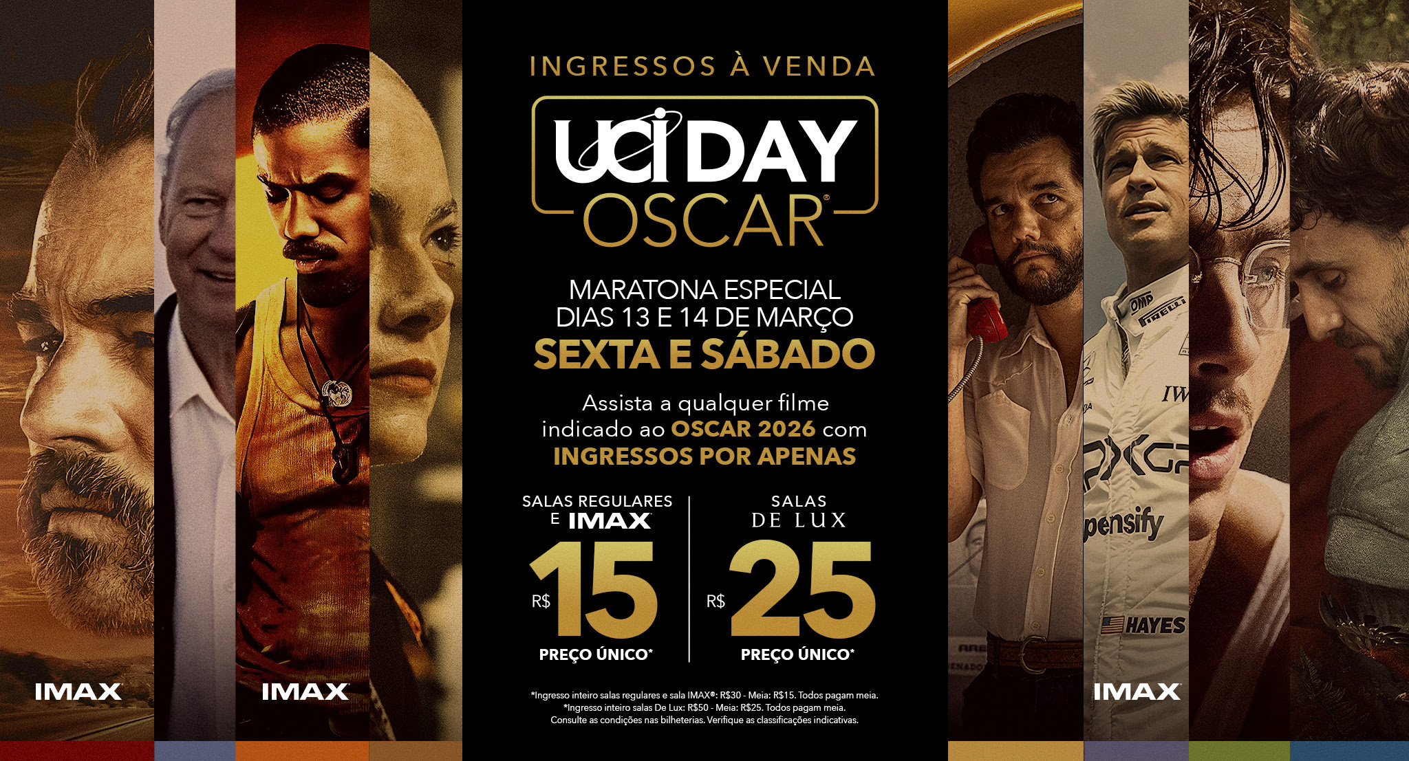 A 98ª cerimônia do Oscar está chegando e, com ela, volta também um dos eventos mais aguardados pelos apaixonados por cinema: o UCI Day Oscar, a tradicional maratona da UCI Cinemas. Nos dias 13 e 14 de março (sexta e sábado que antecedem a premiação, marcada para o domingo, 15, em Los Angeles), a rede transforma suas salas em ponto de encontro para os amantes da sétima arte completarem sua maratona de indicados ou reverem os favoritos em clima de torcida. E o melhor: com ingressos a R$ 15 nas salas convencionais e IMAX e R$ 25 nas salas DE LUX – valores especiais para todos os clientes.