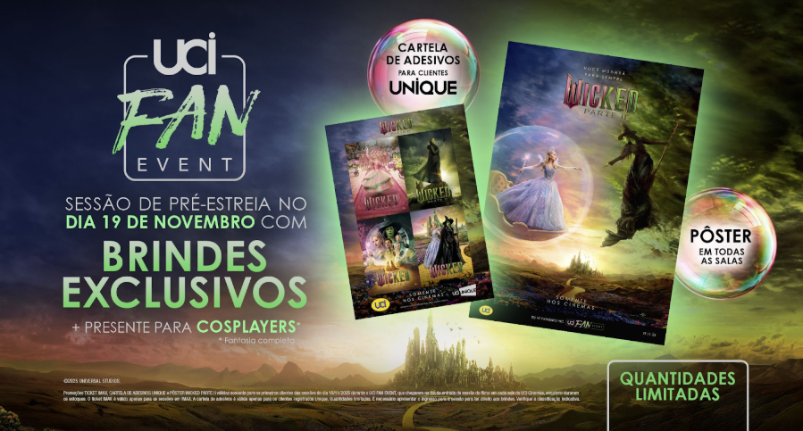 Os fãs do universo de Oz têm um encontro marcado na UCI Cinemas. No dia 19 de novembro, a rede promove um Fan Event especial de Wicked: Parte II. É a chance perfeita de assistir à aguardada conclusão da história de Glinda e Elphaba antes da estreia oficial. Quem participar das sessões de pré-estreia ganhará brindes exclusivos: pôster para todos os clientes, ticket colecionável nas salas IMAX e cartela de adesivos exclusiva para participantes do UCI Unique, programa de relacionamento da rede. Quem for caracterizado com fantasia completa também receberá um presente especial durante o evento. Os ingressos já estão disponíveis no site oficial e nas bilheterias.