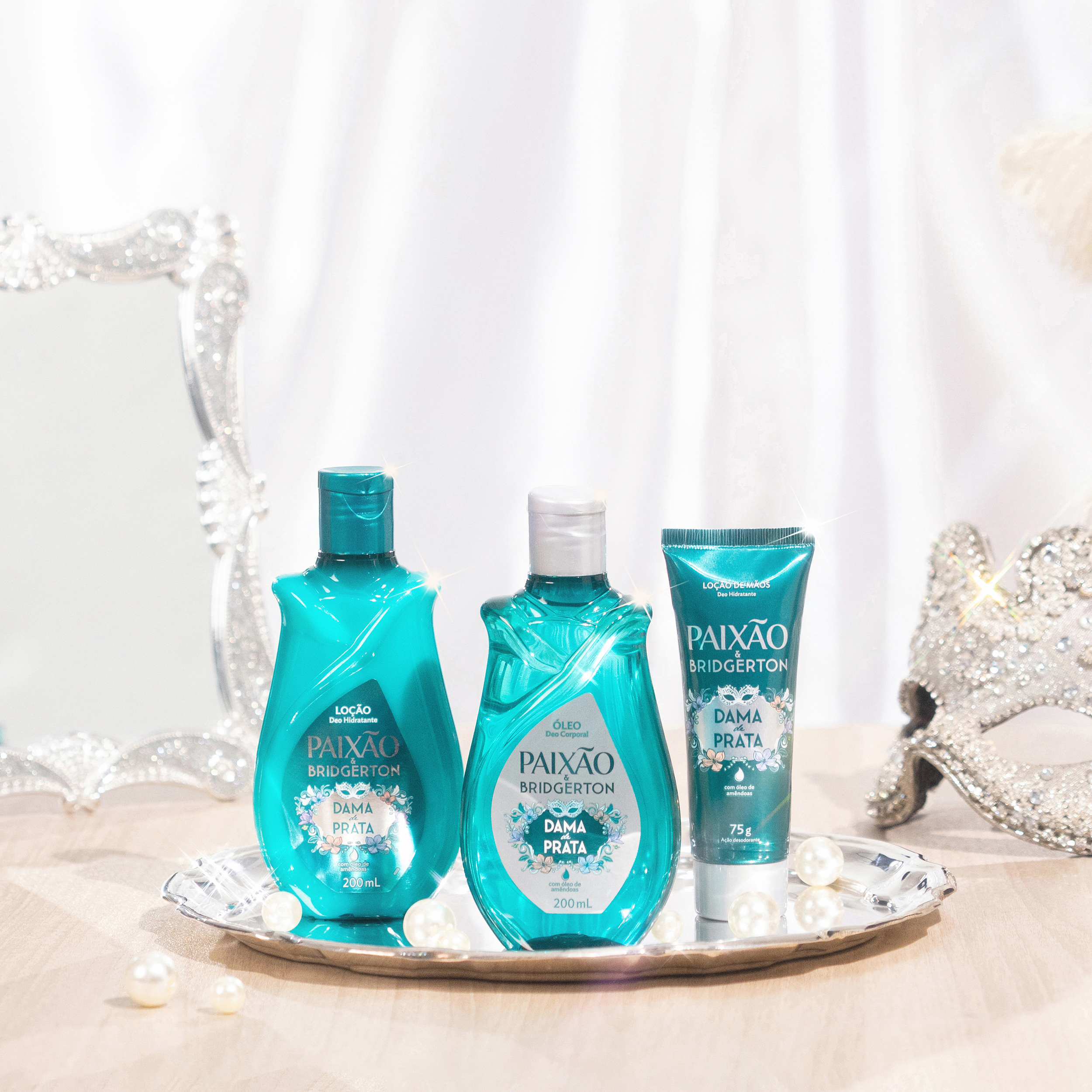 Composta por três itens, Paixão Bridgerton Dama de Prata conta com loção hidratante corporal 200 ml, óleo corporal 200 ml e loção de mãos 75 g, todos produtos formulados com óleo de amêndoas, além de oferecerem textura leve, rápida absorção e 24 horas de hidratação. Os produtos também são cruelty-free, sem parabenos e dermatologicamente testados. Em breve, a linha ganhará um kit presenteável, com versões de 100 ml da loção e do óleo em embalagem especial.