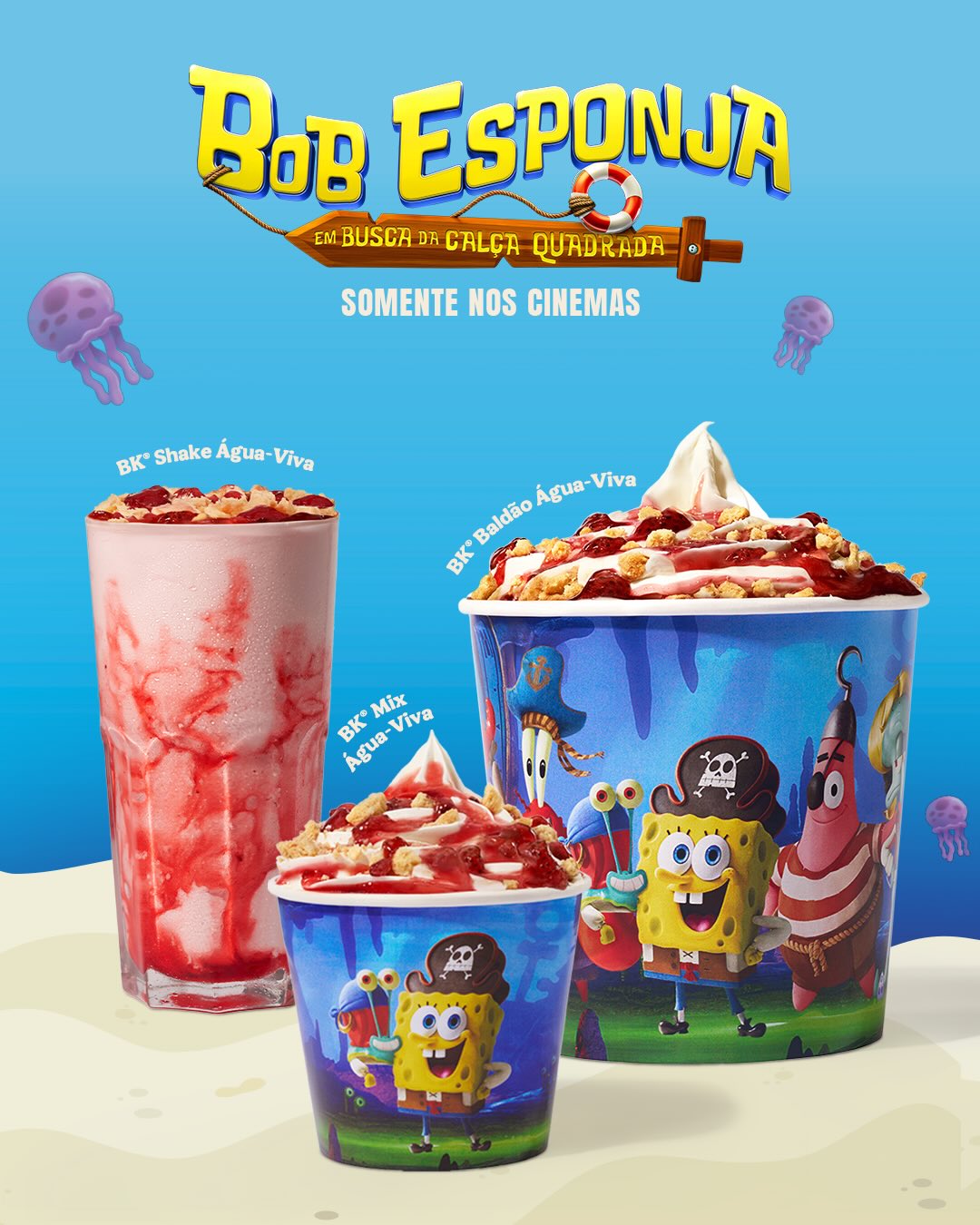 Além disso, foram lançadas três novas sobremesas temáticas inspiradas no universo do personagem. O BK Shake Água-Viva é uma bebida feita com calda de morango, farofa de cookies e massa sabor baunilha, já o BK Mix Água-Viva, combina os mesmos ingredientes na forma de sorvete, para finalizar, o BK Baldão Água-Viva é uma versão maior da sobremesa anterior, ideal para compartilhar.